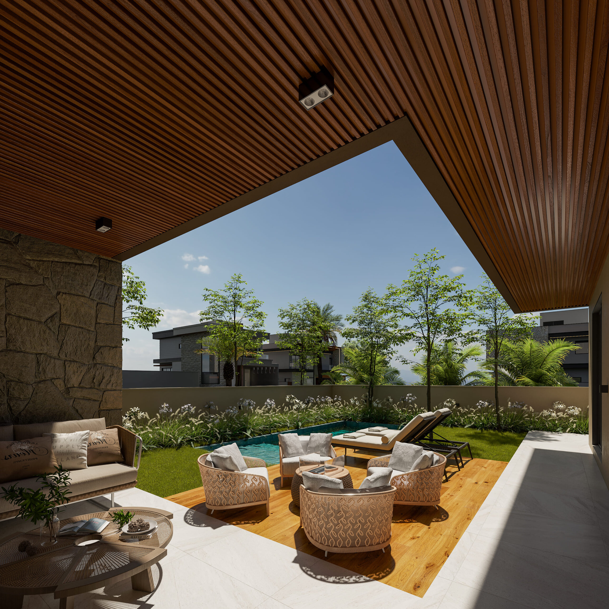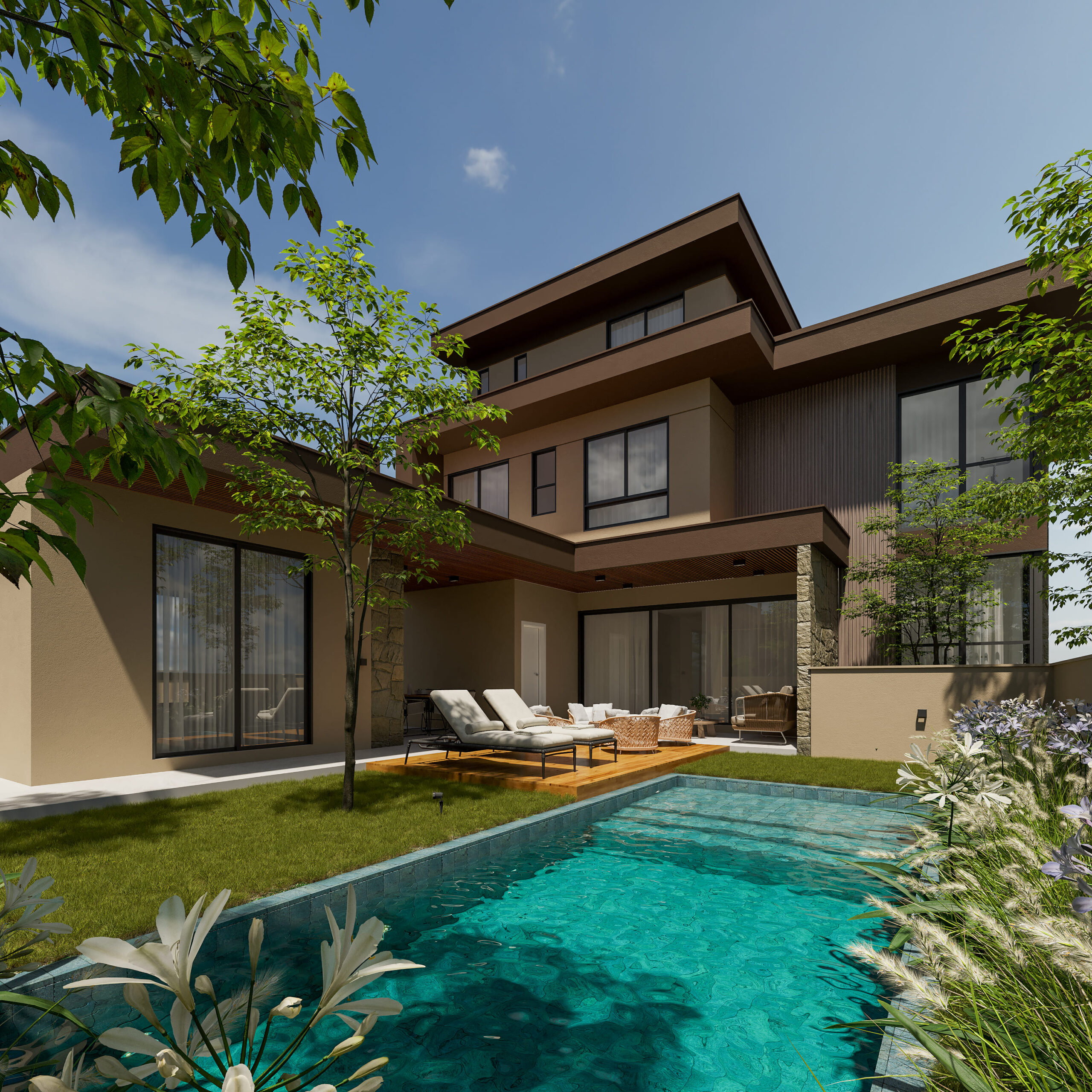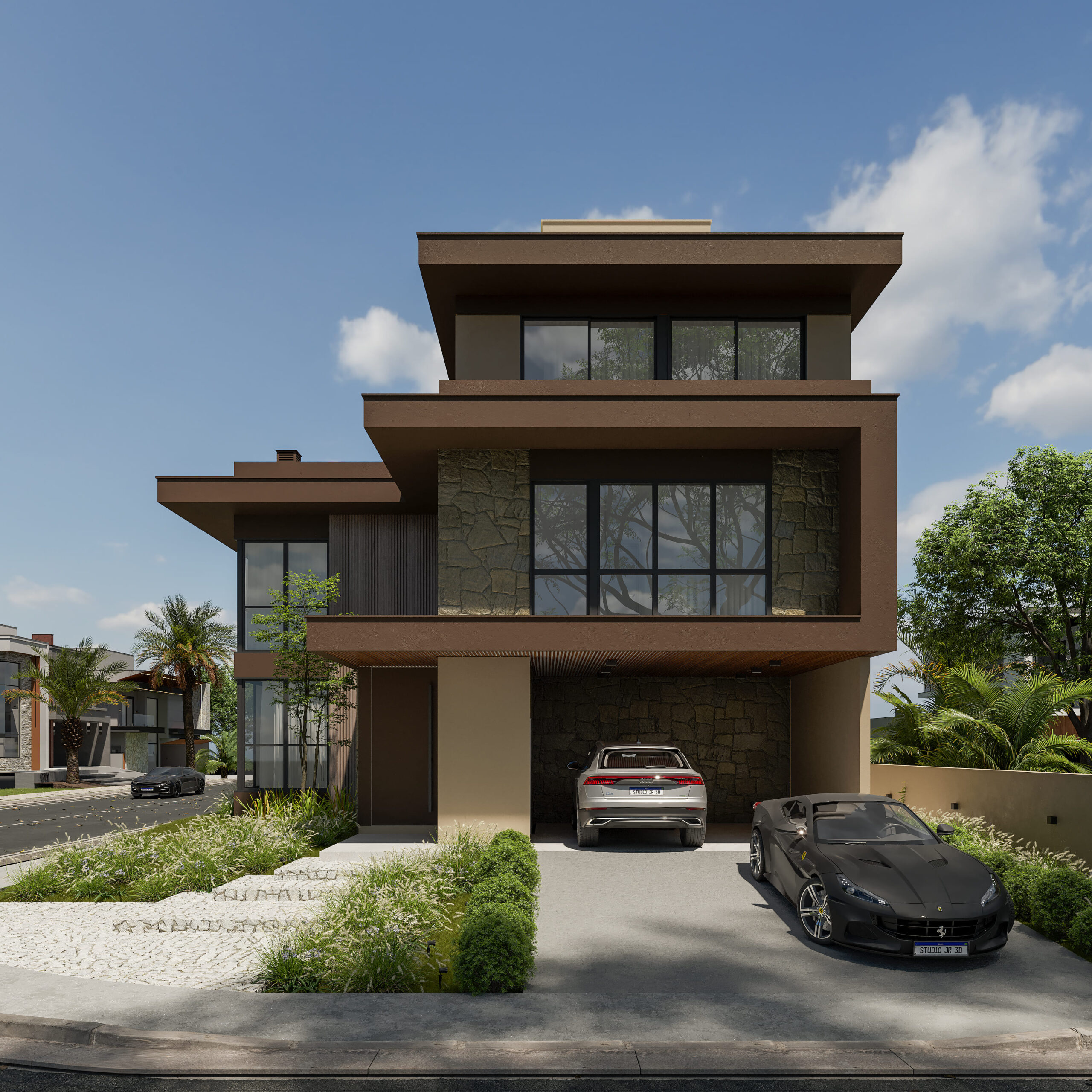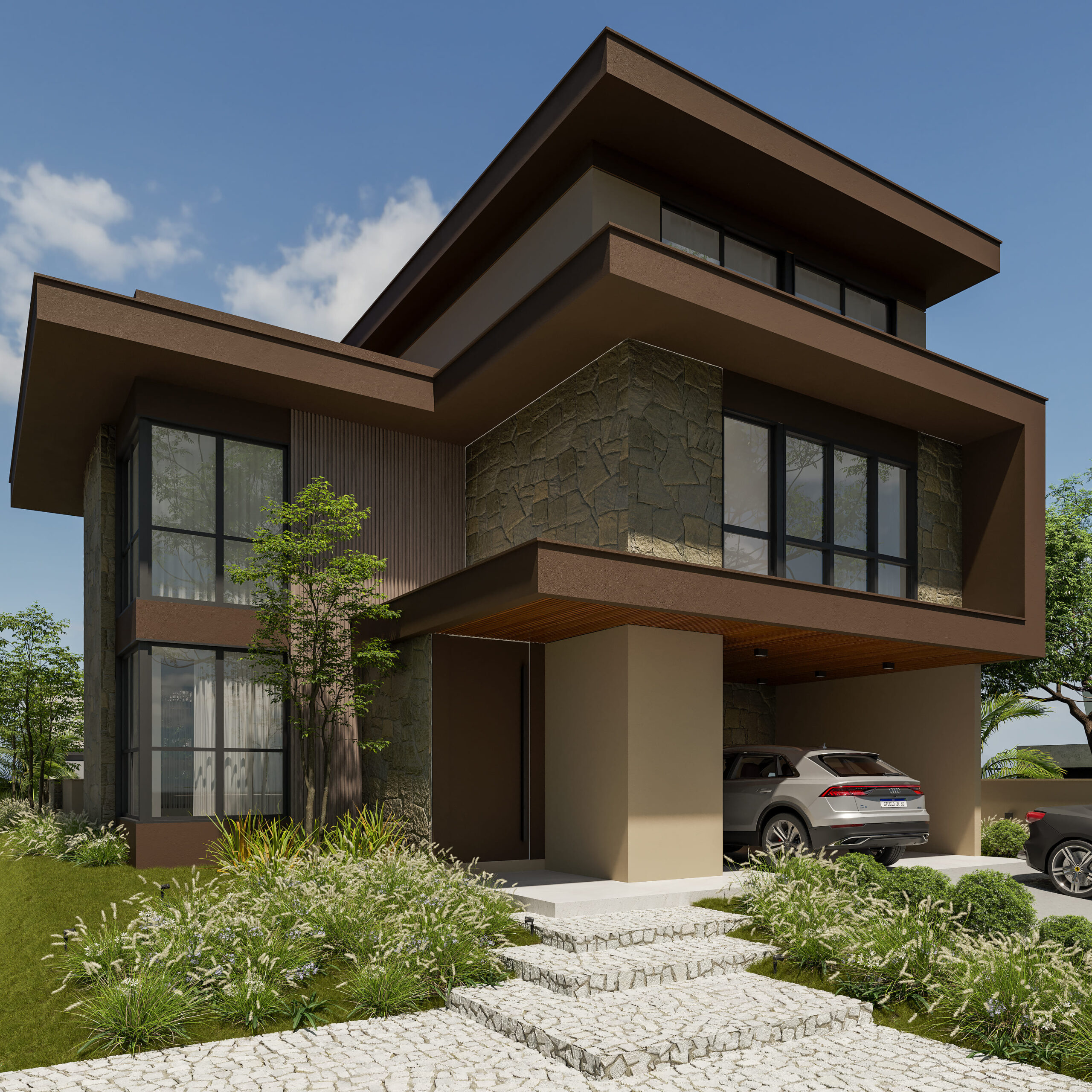 Com 350m² distribuídos em três pavimentos, esta residência combina elegância, tecnologia e integração com a natureza. O uso de materiais naturais, como pedra e madeira, cria uma atmosfera acolhedora e sofisticada, realçada por linhas marcantes e volumes bem definidos.